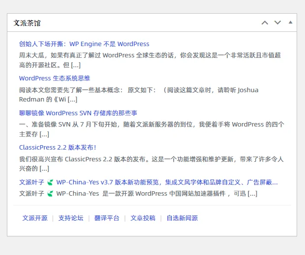 2 、根据更新频率进行新闻推送,您的新闻源长期不更新也将会默认显示为文派茶馆 WPTEA.com 新闻源,以便填补小工具数据栏位。
